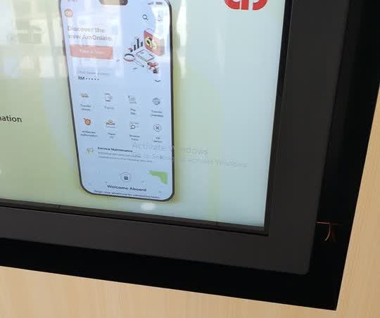 一踏入銀行,想說可以像以前那樣從銀行裡頭架設的自助櫃檯(kiosk)拿排隊號碼並且等候服務,沒想到迎接我的卻是一大片的玻璃螢幕,上面顯示著一個表情冷冰冰的虛擬人物,旁邊的紅色對話框則有一個 QR 碼。