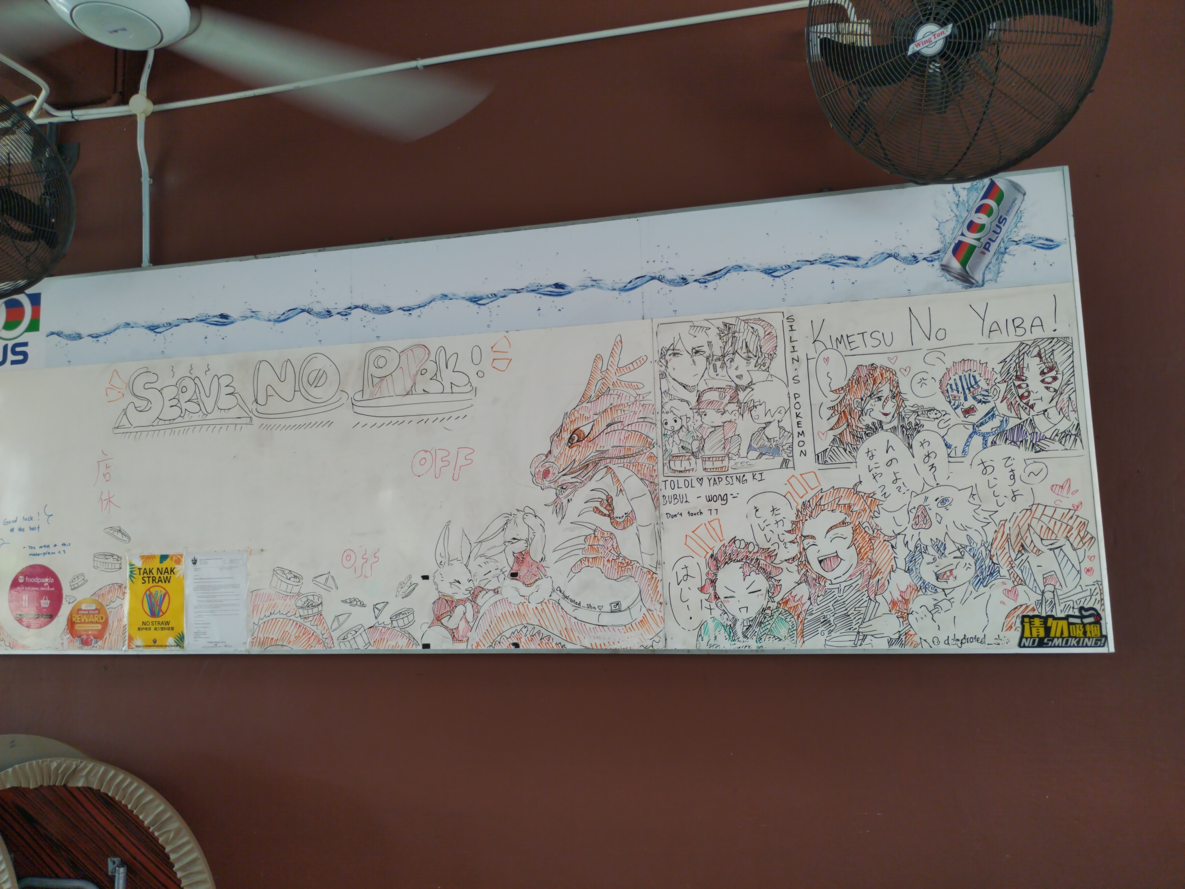 兩年前回到家鄉山打根的時候,某天和家人到某間茶餐廳吃東西,偶然看到牆上通常用來寫上菜單或告示的白板,竟然被一位有才華的繪者用不同顏色的 marker 畫上精美繪圖,其中還有漫畫《鬼滅之刃》和 Pokémon 電玩的角色!