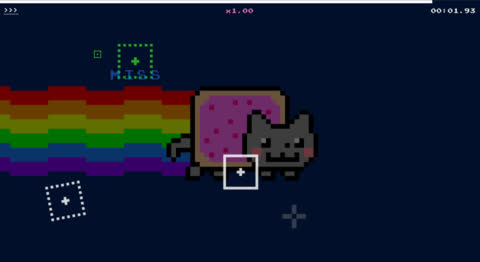 Nyan Cat 節奏遊戲:以 Nyan Cat 歌曲節奏爲基礎的簡單節奏遊戲,只要跟隨音樂節奏並在代表音符的實線方塊與從螢幕外飛過來的虛線方塊重疊的時機觸碰對應的方塊即可!比較適合在手機遊玩。