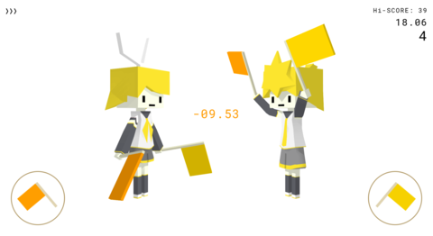 Rin Len Flags:考驗反應速度的手旗信號小遊戲。玩家扮演左邊的鏡音鈴,並需以最快的時間跟隨右邊鏡音連的手旗信號。完成一輪即得一分,看你能在 30 秒內得到多少分?在電腦的話可用左右方向鍵控制旗幟,而在手機的話可使用畫面上的兩個旗幟按鈕。