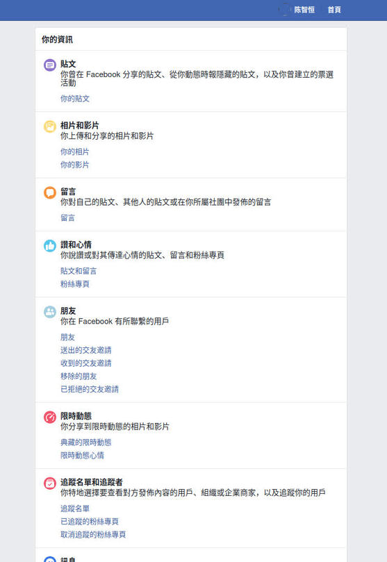 在前文提到,我在將自己的 Facebook 帳號刪除前有事先下載了一份帳號資料存起來。