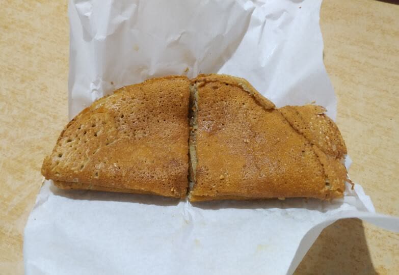 雖然維基百科說這個糕點在馬來文稱作 apam balik,不過其實一般的 apam balik 和這款夾餅不盡相同:apam balik 的外皮較薄也較酥脆,而這個夾餅的口感則比較類似煎蛋,吃起來較綿密,孔隙也較多。