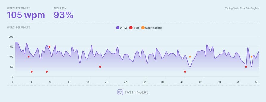 同場加映——我順便去做的英打測驗成績(單字模式、一般難度;當時使用的測驗網站名稱可在下圖找到):